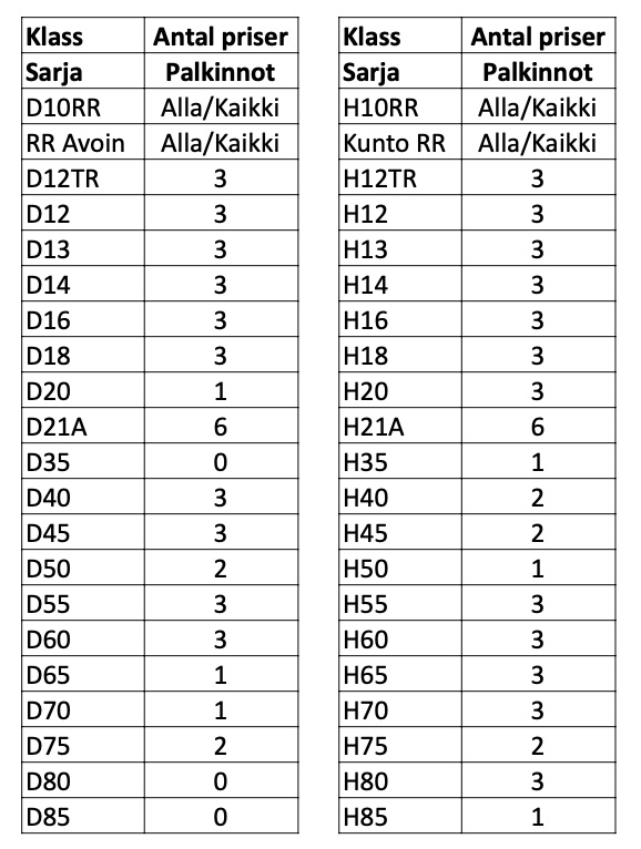 - Kaikki RR-sarjalaiset saavat erikoispalkinnon kaikkina päivinä. Tervetuloa Infoon noutamaan tämä maaliintulon jälkeen. (Ei palkintoja yhteiskilpailun perusteella.)
